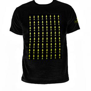 Das Humboldt-Logo-T-Shirt ist ein flottes, auf der Vorderseite per Siebdruck mit gelben Mammutbäumen bedrucktes schwarzes T-Shirt.