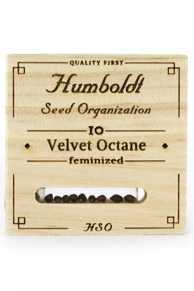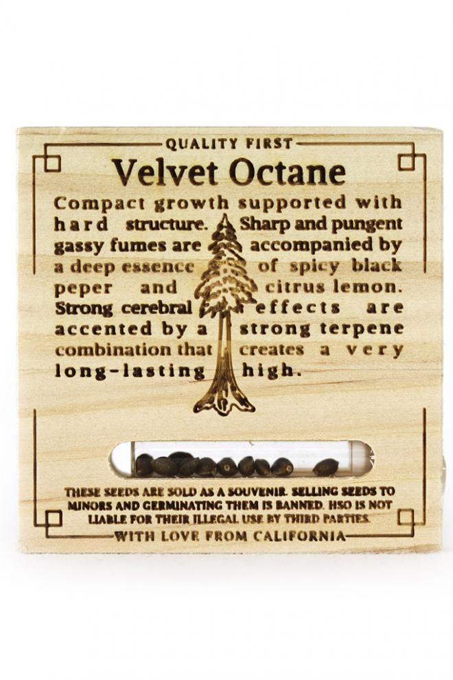 Velvet Octane sviluppa delle ramificazioni laterali molto resistenti che permettono una maggiore produzione di cime durante la fioritura. Il profilo terpenico, una complessa combinazione di sostanze aromatiche dominata dai terpeni beta-mircene e beta-cariofillene, si traduce in un odore molto diesel con sfumature di pepe nero e limone, ed incrementa al contempo la potenza dell'effetto, un potente sballo cerebrale ideale da godersi a fine giornata.